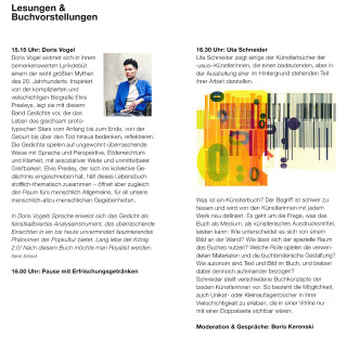 Schneider stellt verschiedene Buchkonzepte der beiden Künstlerinnen vor. So besteht die Möglichkeit, auch Unikat- oder Kleinauflagenbücher in ihrer Vielschichtigkeit zu erleben, die in einer Vitrine nur mit einer Doppelseite sichtbar wären.